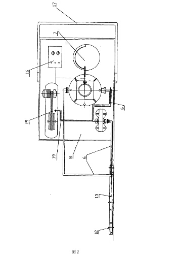 其1防爆儲罐,2噴射橫管,3噴射豎管,4氣動隔膜泵,5自動清洗過濾器,6軟膠管,7清污容器,8手推車,9吸油管,10清污隧道,11吸油口,12卡箍,13噴油口,14快速接頭,15空氣壓縮機,16電器控制柜,17手推柄,18筋,19高壓氣管。