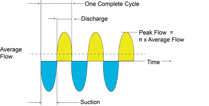 1. 泵送動作是由往復動作發展而來的。這種往復運動產生流動正弦波。實際流量由圖 1 中的公式確定。