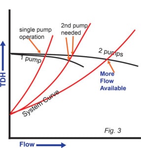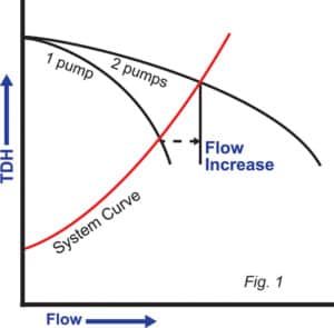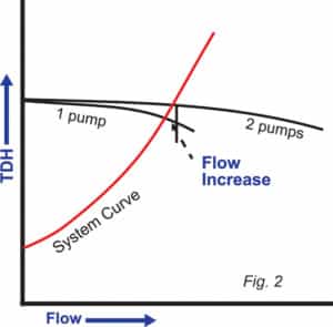 例如,假設有一組固定噴嘴,其中系統阻力是純摩擦的,并且僅作為流量變化的結果而變化。當引入第二個泵時,系統中的阻力會隨著流量的增加而增加。