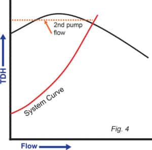 在圖 4 中,系統曲線和 TDH 曲線在大于關閉 TDH 值的 TDH 和低于曲線的最大 TDH 的 TDH 處相交。當第二個泵啟動時,流量將僅增加到 TDH 與系統壓力匹配的第一個點。