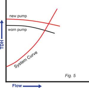 當一個泵磨損時,可能會出現類似的情況。這在圖 5 中有所提及。隨著泵的磨損,在任何給定流速下產生的 TDH 量都會減少。如果新泵與系統曲線的交點并聯在磨損泵的關閉TDH之上,它將迫使磨損泵進入關閉狀態。