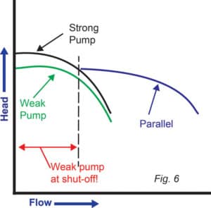 如果一個泵表現出較低的關閉 TDH 特性,它將在關閉狀態下運行,直到主導泵在其曲線上移動足夠遠,以至于其 TDH 低于具有較低揚程的泵的關閉 TDH(圖 5 )。